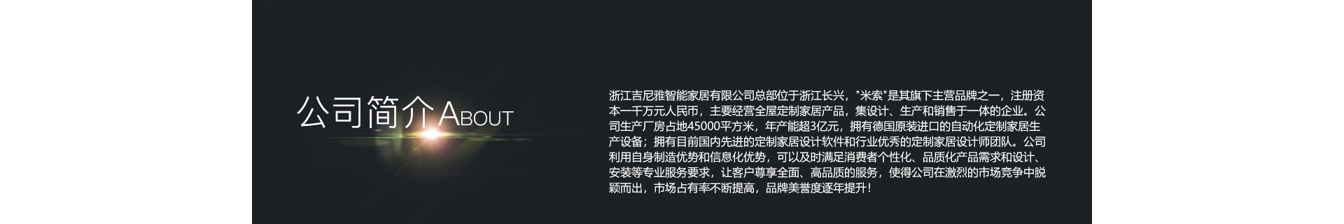 浙江吉尼雅智能家居有限公司 地址:浙江省湖州市長(zhǎng)興縣李家巷鎮(zhèn)青草塢工業(yè)走廊188號(hào) 網(wǎng)址:https://www.misonyigui.com/ 電話:0572-6683752